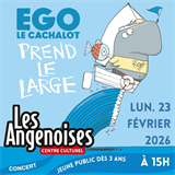 Lundi 23 Février 2026 à 15h aux Angenoises « Ego le cachalot prend le large »- CONCERT Jeune Public « La rentrée est compliquée pour Ego le cachalot. Ses camarades à l’école, Igor le castor en tête, se moquent de son poids. Rabougri, le nouvel instituteur, ne l’a pas à la bonne du fait de son profil hors normes. Enfin ses parents à la maison, Merlin le requin et Marlène la baleine continuent à se chamailler. Bref, la rencontre avec Yaya le panda, une jeune militante pour le climat, tombe à pic. De passage dans sa ville pour un meeting, elle lui propose de partir avec elle pour un boat-trip jusqu’à New-York où doit se tenir le sommet sur la planète. Ce sera l’occasion de faire de nouvelles rencontres singulières et de permettre au jeune cachalot de comprendre un peu mieux le monde complexe dans lequel il évolue ».