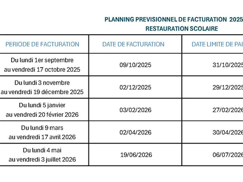 Calendrier prévisionnel de la facturation 2025-2026 - restauration scolaire