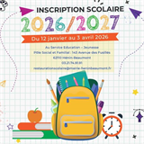 05/01 Inscription Scolaire Septembre 2026 La campagne d'inscription scolaire pour la rentrée de Septembre 2026 débute le lundi 12 Janvier et se termine le vendredi 3 Avril 2026. Vous pouvez retrouver ci-dessous les différents documents à compléter et à retourner au service Éducation - Jeunesse en vue de l'inscription de votre enfant. Lire la suite