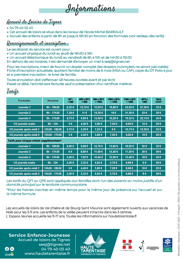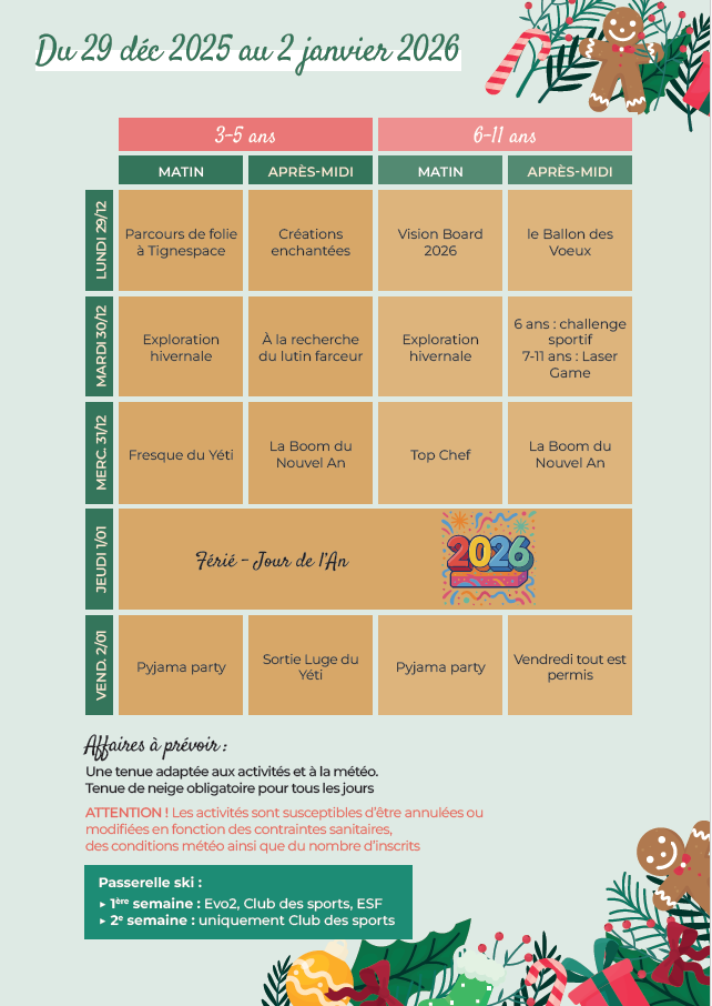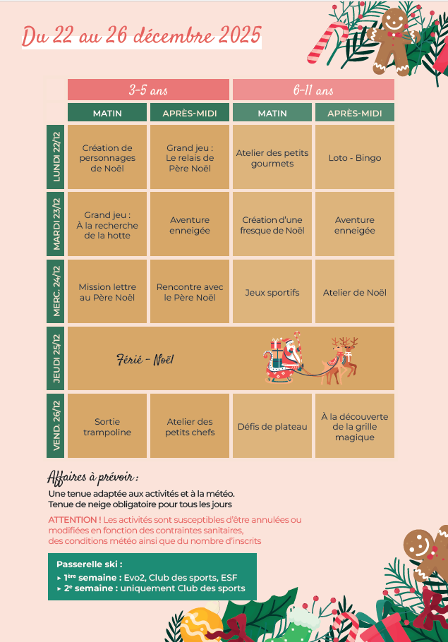 Vous trouverez ci-joint le planning des activités proposé à vos enfants pour les vacances de Noël