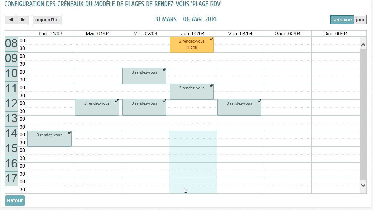 Dans l'exemple ci-dessous, la plage horaire sélectionnée correspond au jeudi 03/04 de 14h00 à 17h30.