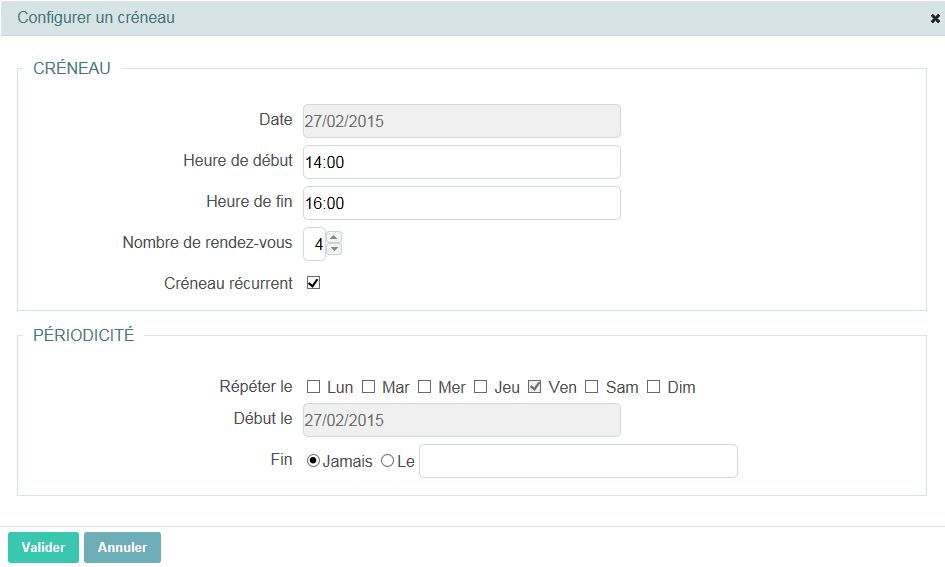 Dans l'exemple ci-dessous, 3 rendez-vous seront possibles pour un jour et un créneau horaire donnés. Si ces trois rendez-vous sont réservés, ce créneau ne sera plus proposé.