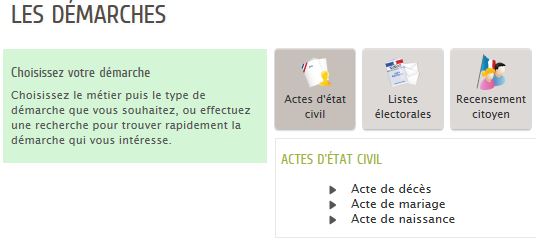 Exemples d'affichage dans l'Espace Citoyens : Pour le métier "Actes d'état civil" sont définis des types de demande système "Acte de décès", "Acte de mariage", "Acte de naissance".