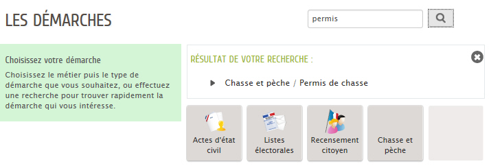 Exemple : le mot-clé "permis" est saisi dans la zone de recherche d'une nouvelle démarche dans l'Espace Citoyens, il entraîne l'affichage du ou des types de demande définis avec ce mot-clé.