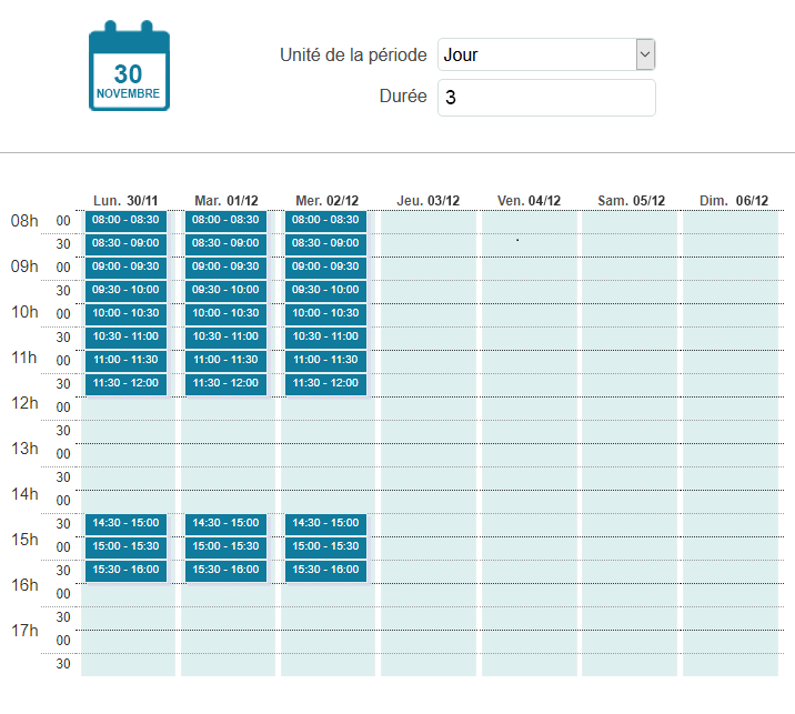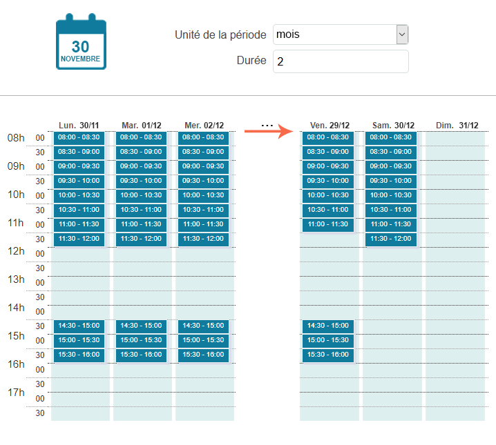 Le 30/11, seuls les créneaux jusqu'au 31/12 seront proposés.