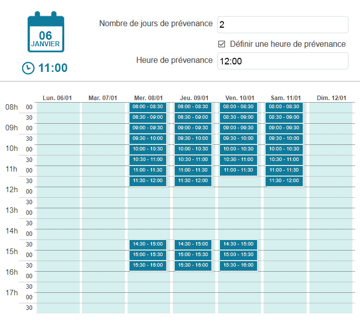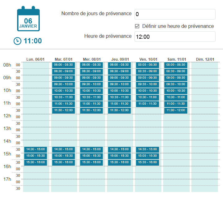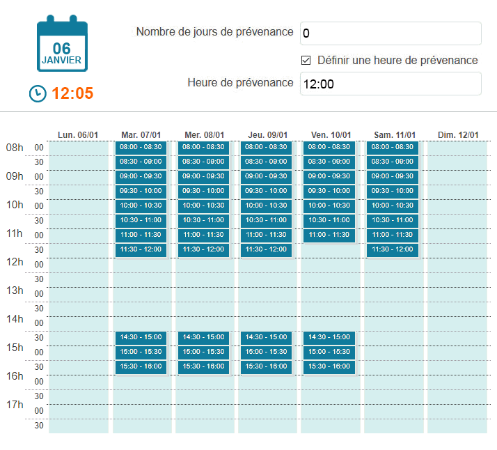Passé ce délai, les créneaux du jour seront masqués. Seuls les créneaux du lendemain et des jours suivants seront affichés.
