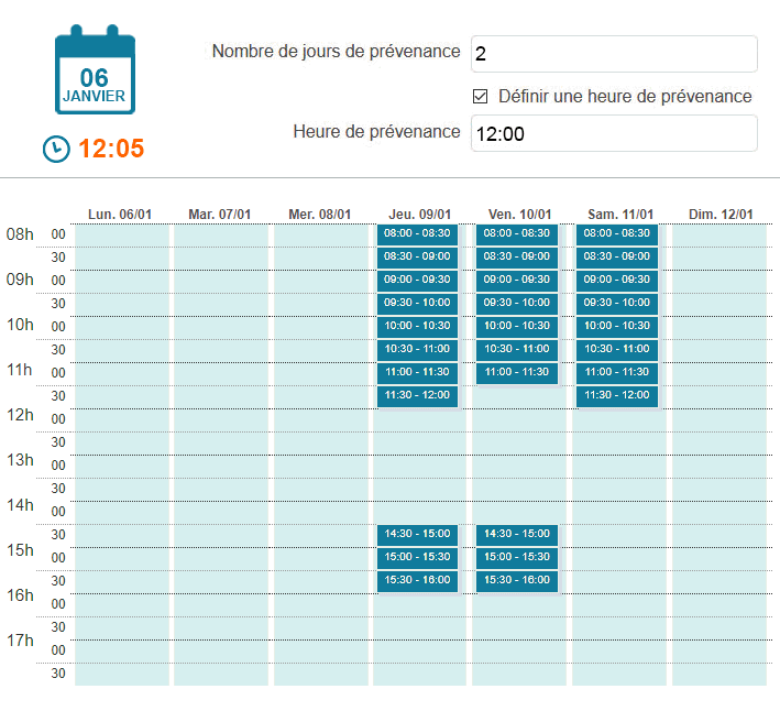 Un délai est défini sur deux jours avec une heure à 12h00. Le lundi, il sera seulement possible de prendre rendez-vous à partir du mercredi et les jours suivants jusqu'à 12h00