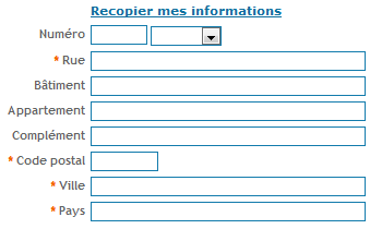 Adresse : Paramétrage : - obligatoire ou non. Affichage d'un ensemble de champs de saisie. |