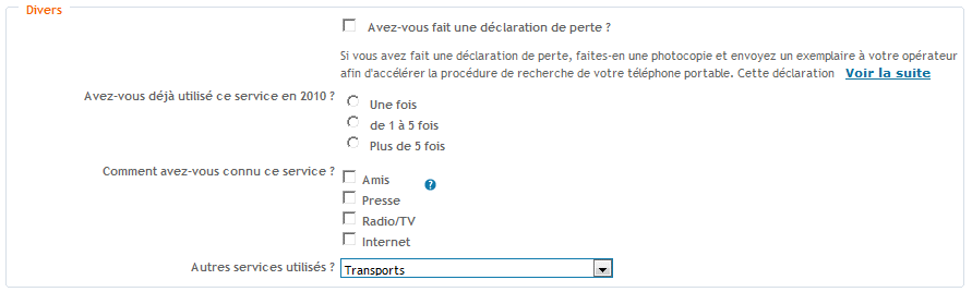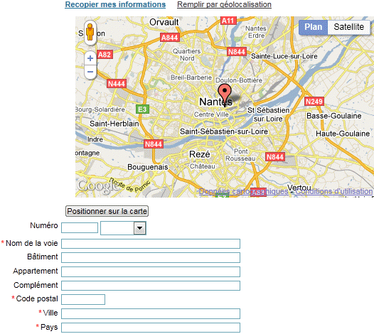 - "Recopier mes informations" et localisation sur la carte si l'adresse est reconnue. - "Remplir par géolocalisation", cette option concerne l'utilisation sur un téléphone mobile ou un ordinateur portable. - "Positionner sur la carte", cette option est à utiliser après avoir saisi les premiers caractères d'une voie, puis sélectionné la voie dans le champ "Nom de la voie".