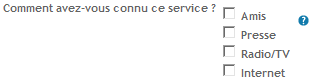 Liste de cases à cocher : Paramétrage : - texte d'aide, - obligatoire ou non, - nombre maximum de valeurs sélectionnées, - valeurs fournies par un système externe si la case correspondante est cochée, sinon : - saisie des différentes valeurs de la liste Plusieurs sélections possibles. |