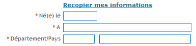 Naissance : Paramétrage : - obligatoire ou non. Affichage d'un ensemble de champs de saisie. |