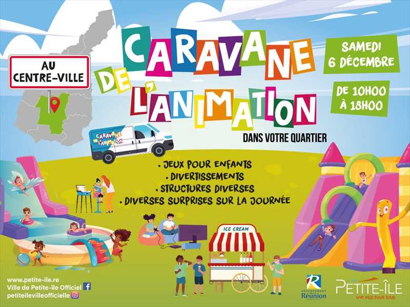 Le quartier du Centre-Ville accueille la caravane de l'animation, le samedi 6 décembre de 10h00 à 18h00. Structures gonflables et aquatiques, ateliers maquillage, challenges et défis vous attendent sur l'ensemble de la journée ! Le programme sur le site de la ville https://www.petite-ile.re