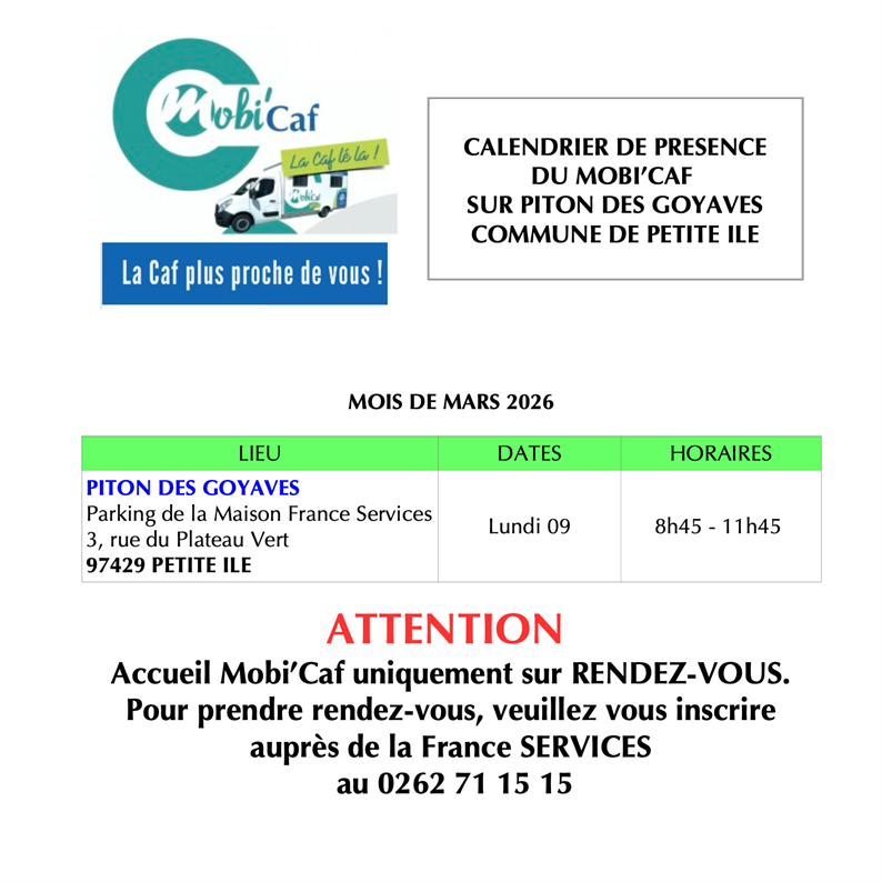 Calendrier de passage du Mobi'Caf à Piton des Goyaves :Mois de mars 2026.