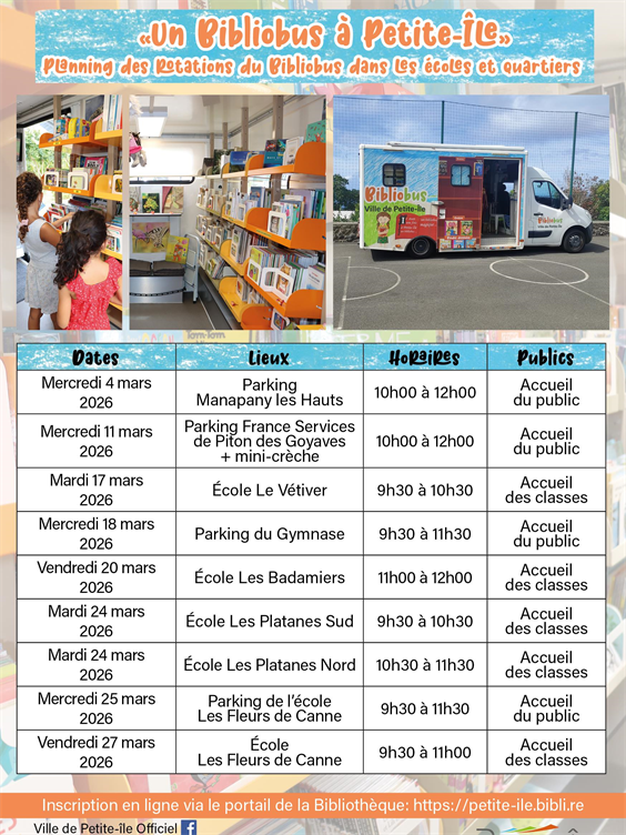Date de passage du Bibliobus dans vos quartiers du 4 au 27 mars 2026.