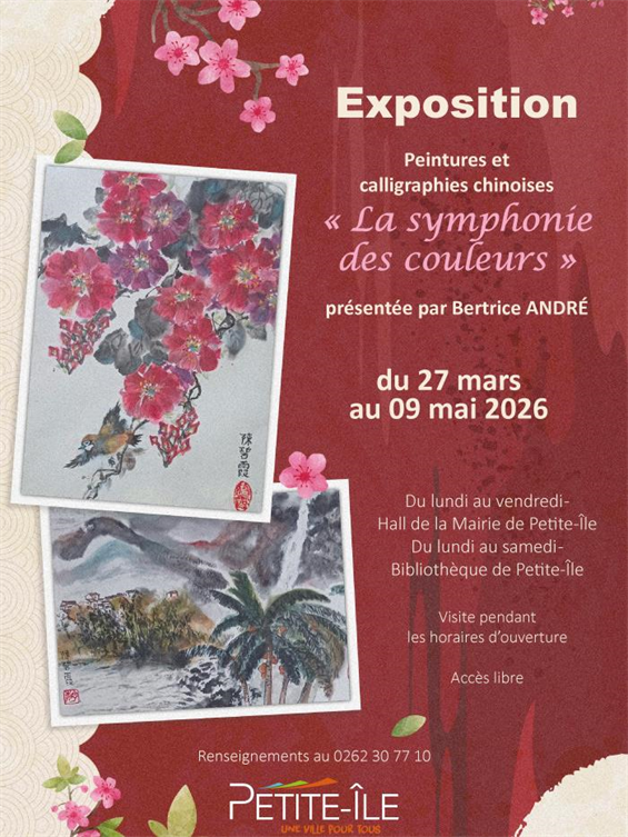 Exposition : Peintures et calligraphies chinoises "La symphonie des couleurs" présentée par Bertrice André du 27 mars au 09 mai 2026. Du lundi au vendredi - Hall de la Mairie de Petite-Île. Du lundi au samedi - Bibliothèque de Petite-Île. Renseignements au 0262 30 77 10. Visite pendant les horaires d'ouverture. Accès libre.