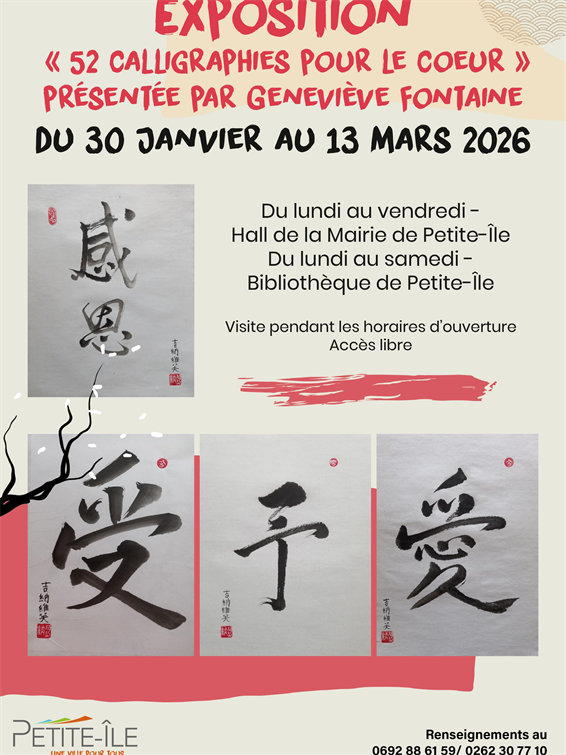 Exposition "52 calligraphies pour le coeur" présentée par Geneviève Fontaine du 30 janvier au 13 mars 2026. Du lundi au vendredi - Hall de la Mairie de Petite-Île. Du lundi au samedi - Bibliothèque de Petite-Île. Visite pendant les horaires d'ouverture. Accès libre.