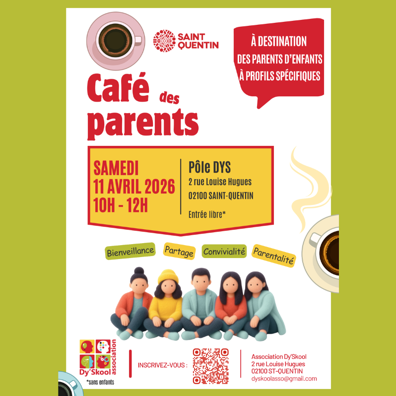 Un temps d’échange entre parents L’association Dy’Skool propose un Café partage ! Samedi 11 avril, de 10h à 12h, au Pôle Dys – 2 rue Louise Hugues à Saint-Quentin Thématique : « Défi d’être...