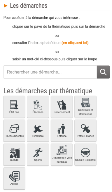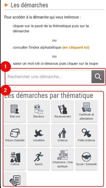- > 1. Cliquez sur l'icône de la thématique recherchée, puis cliquez sur la démarche à effectuer.