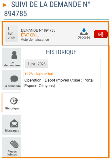 Historique : liste des événements concernant la demande. - >