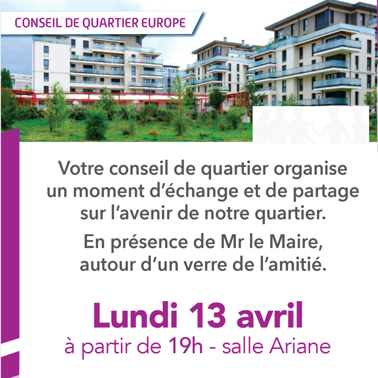 Réunion d'informations du conseils de quartier Europe le 13 Avril jusqu'à 19h00 Votre conseil de quartier organiseun moment d’échange et de partagesur l’avenir de notre quartier.En présence de Mr le Maire,autour d’un verre de l’amitié. Lire la suite