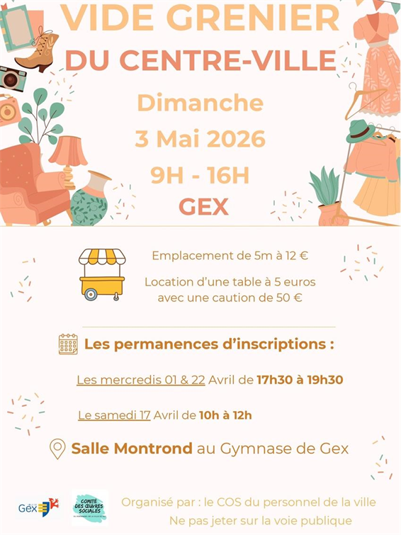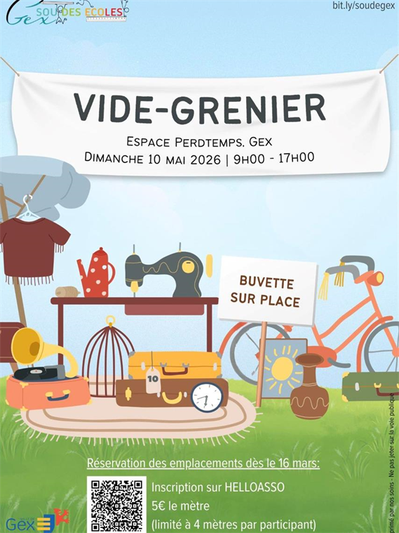 Le Sou des écoles de Gex vous convie à son traditionnel : Vide-grenierDimanche 10 mai 2026 De 9h00 à 17h00 Espace Perdtemps (01170, Gex) Venez arpenter les allées et trouver le vêtement, objet, jouet...